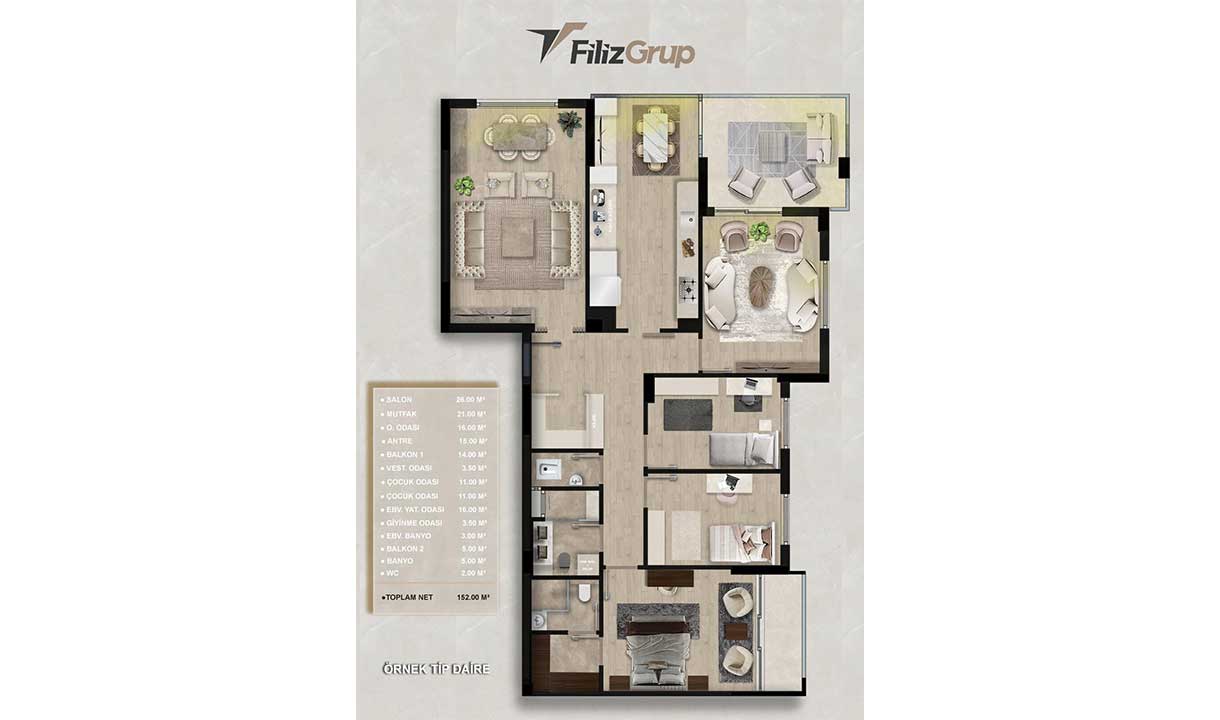 Her biri 152 m² net kullanım alanına sahip dairelerde; ferahlık, fonksiyonellik ve estetik detaylar özenle bir araya getirilmiştir. Gün ışığını en verimli şekilde içeri alan planlaması, kaliteli yapı malzemeleri ve mimari detaylarıyla Safir Çubuk, sadece bir konut değil, uzun yıllar huzurla yaşayacağınız bir yuva sunar.